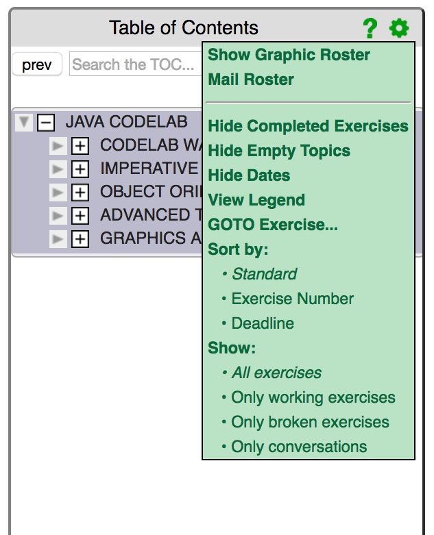 Once you're registered and logged in, look at the list of exercises in the left panel. You should view these "by deadline"—if you click the cog in the top right corner of the panel, you'll see this menu: